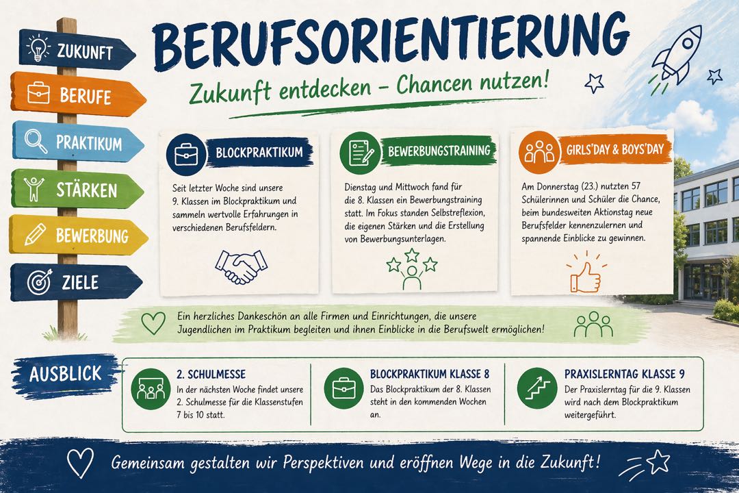 All diese Aktivitäten zeigen: Berufsorientierung hat an unserer Schule einen hohen Stellenwert. Unser Ziel ist es, unsere Schülerinnen und Schüler bestmöglich auf ihren individuellen Weg in die Zukunft vorzubereiten – praxisnah, vielfältig und mit starken Partnern an unserer Seite.