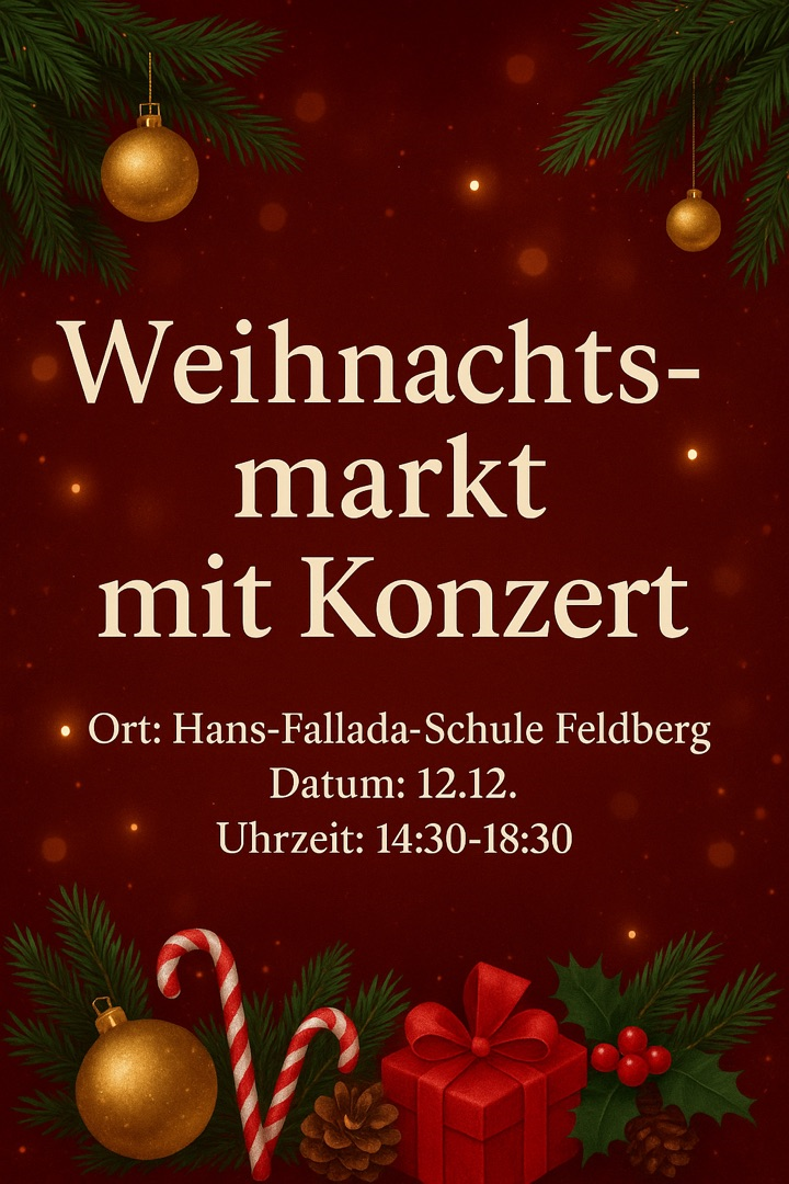 Die Schülerinnen und Schüler der Hans-Fallada-Schule Feldberg laden herzlich zum Weihnachtsmarkt mit Konzert ein. Am Freitag, den 12.12., von 14:30 bis 18:30 Uhr gibt es einen bunten Weihnachtsmarkt und einen leckeren Kuchenbasar. Jung und Alt sind herzlich willkommen, einen schönen Nachmittag miteinander zu verbringen.