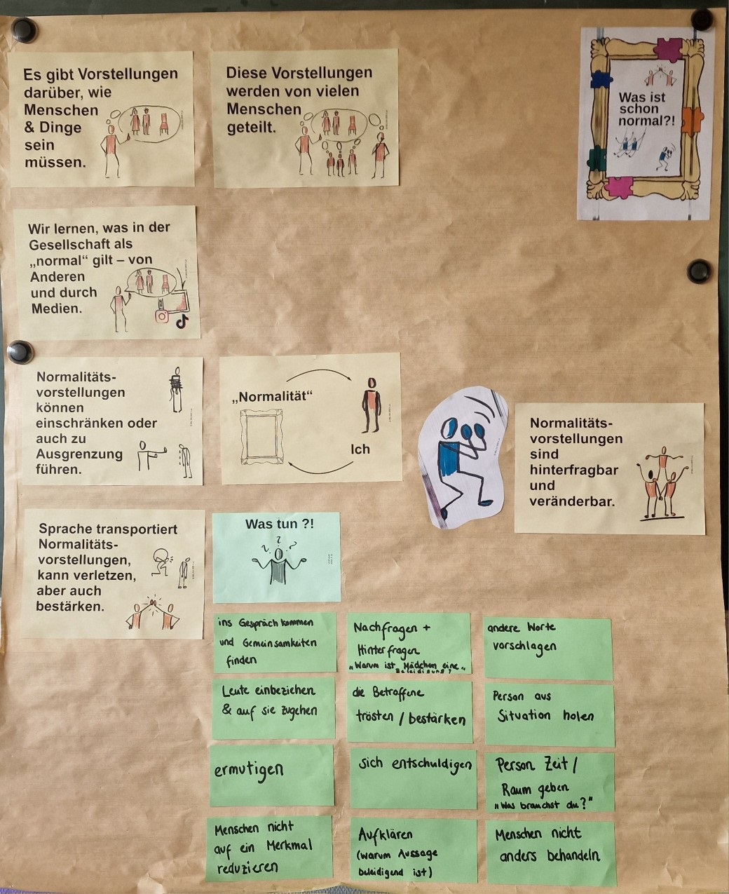 Es ging weiterhin um die Frage, wie Vorstellungen von Normalität unseren Alltag beeinflussen und inwieweit sie unser Verhalten und unser Denken steuern. Die Schüler*innen erkannten, dass ihre eigenen Handlungen, aber auch die Handlungen von anderen, oft von bestimmten Normen geprägt sind, die von Medien, Familie und Gesellschaft vermittelt werden. Sie lernten, dass diese Normen nicht immer gerecht sind und Menschen aufgrund von Unterschieden – sei es Aussehen, Hobbys oder Herkunft – ausgegrenzt werden können.