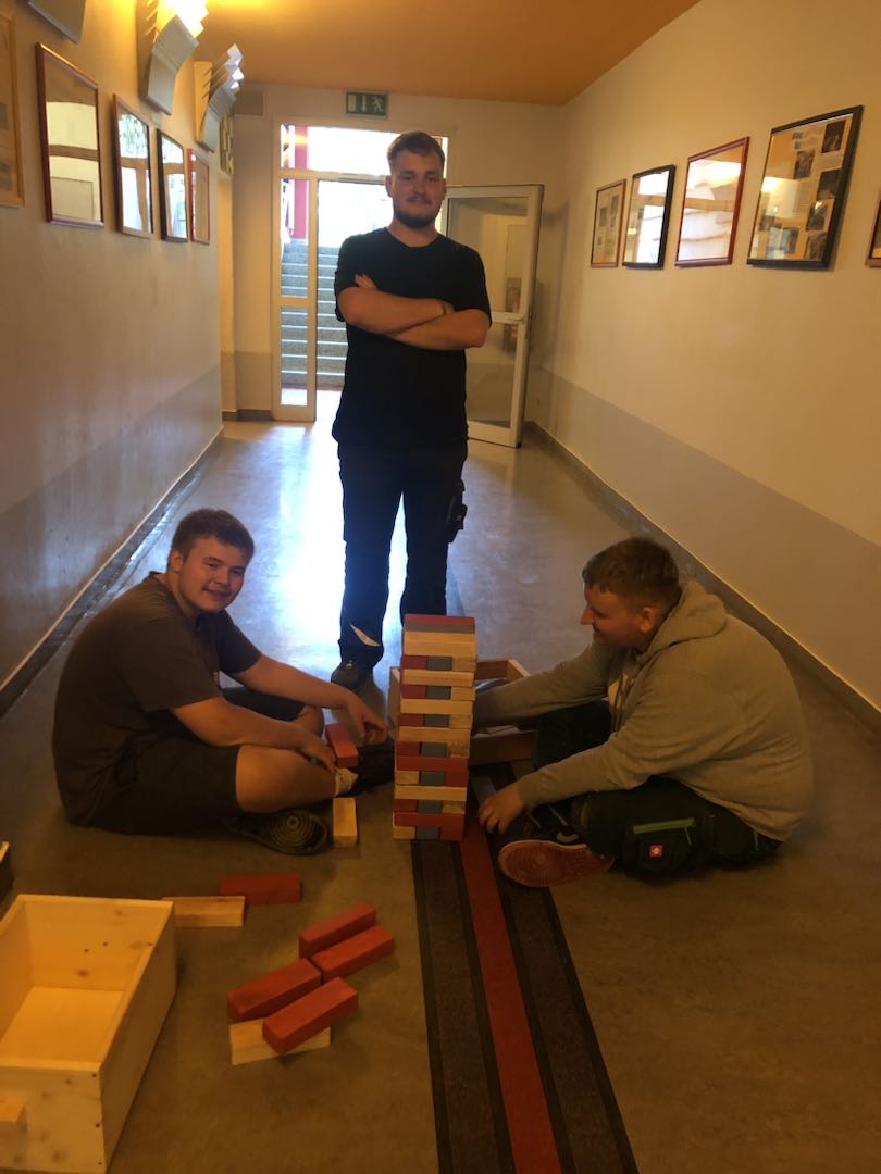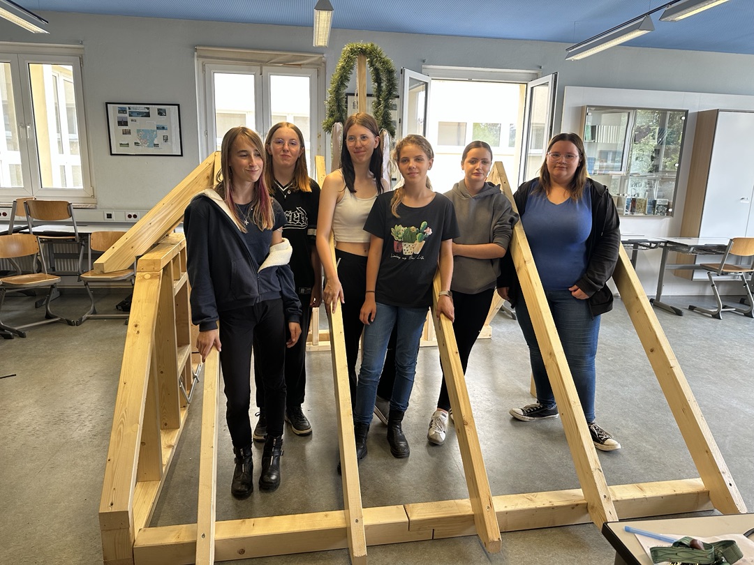 Und dann gab es noch ein echtes Highlight: Die Handwerkskammer baute mit einer Gruppe von Mädchen (!) einen kleinen Dachstuhl im Schulgebäude auf. So fix und perfekt, wie die Mädels das hinbekommen haben, war klar: Handwerk ist ganz sicher keine reine „Männersache“. Ein Mini-Richtfest rundete die Aktion ab – inklusive stolz erhobenem Richtkranz.