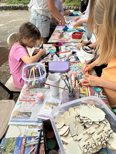 Am Donnerstag folgte das Schulhoffest, das die Kinder selbst mit vorbereitet hatten. Hier war alles vertreten, was Freude macht: An der Bastelstation entstanden lustige Wollmonster, die frisch gebauten Holzspiele aus der Holzwerkstatt wurden eifrig ausprobiert, und auf der Fahrradfahr-Station mit Hindernisparcours konnten die Kinder ihre Geschicklichkeit unter Beweis stellen. Dazu wurde gemeinsam gespielt, gelacht und natürlich auch fürs leibliche Wohl gesorgt. Ein besonderes Highlight war der Seifenblasen-Stand von Frau Fröhlich, der den Schulhof in eine glitzernde Traumwelt verwandelte.