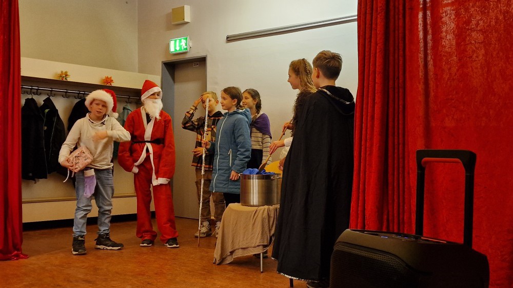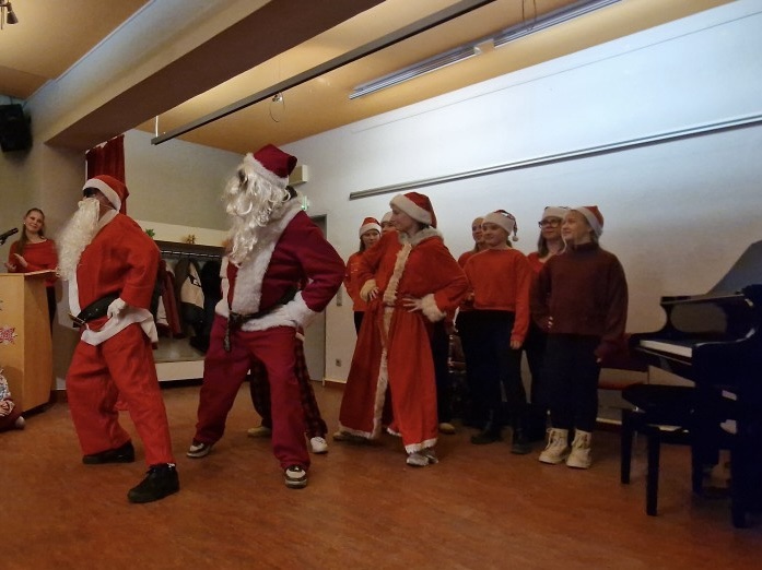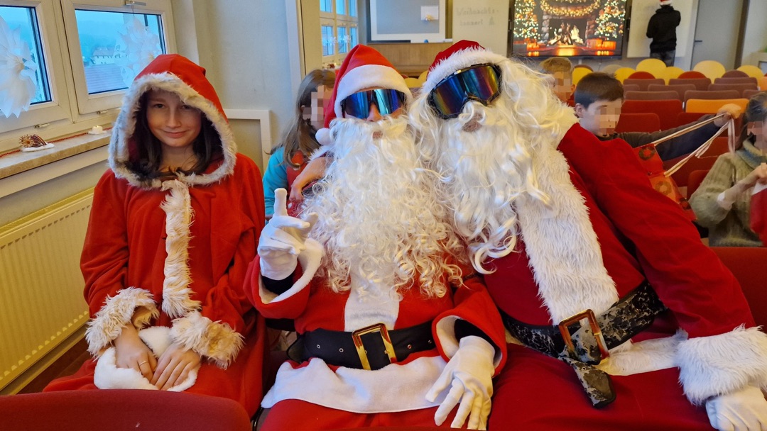 Als beim Einmarsch der Tanzgruppe plötzlich zwei dick ausgepolsterte Weihnachtsmänner in die Aula einzogen – einer davon zuvor ganz standesgemäß mit dem Moped vorgefahren –, blieb einem kleinen Mädchen sprichwörtlich der Atem stehen. Dieses staunende, ehrliche „Oh!“ aus tiefstem Herzen sagte mehr als tausend Worte. Und ganz ehrlich: Auch viele große Augen staunten mit.